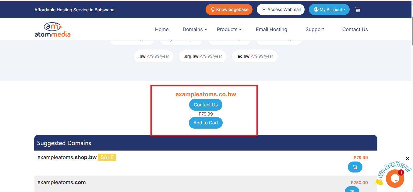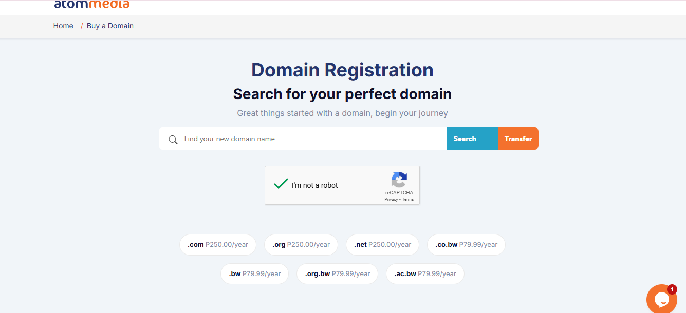 Registering a domain name with Atom Media is an easy process; Firstly visit http://shop.atommedia.co.bw/ and in the click on domains or click here to navigate directly to domain registration page.