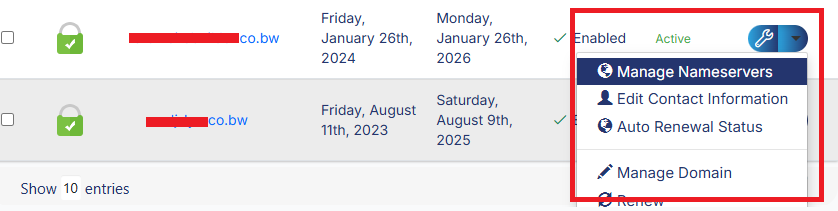 Step 3: Locate the domain you want to update from your domain list. On the far right of the domain row, click the dropdown arrow, then select “Manage Nameservers” to proceed to the nameserver settings.