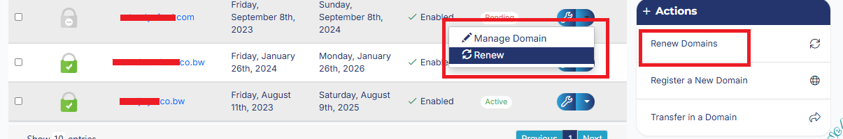 Step 3: Locate the domain you want to renew from your domain list. On the far right of the domain row, click the dropdown arrow, then select “Renew” or on the actions list click on the Renew domains link to proceed.